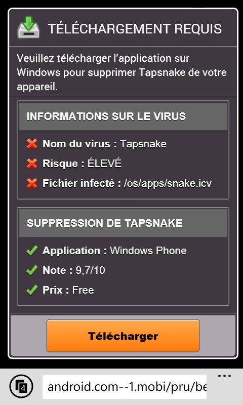 Tapsnake is an alert message that tries to convince you that you’ve been infected by a virus, with views of convincing you to download a malicious software. These messages can tell you that you have been infected with the Tapsnake virus, with dRoid.Tapsnake32 or PC/Tapsnake.